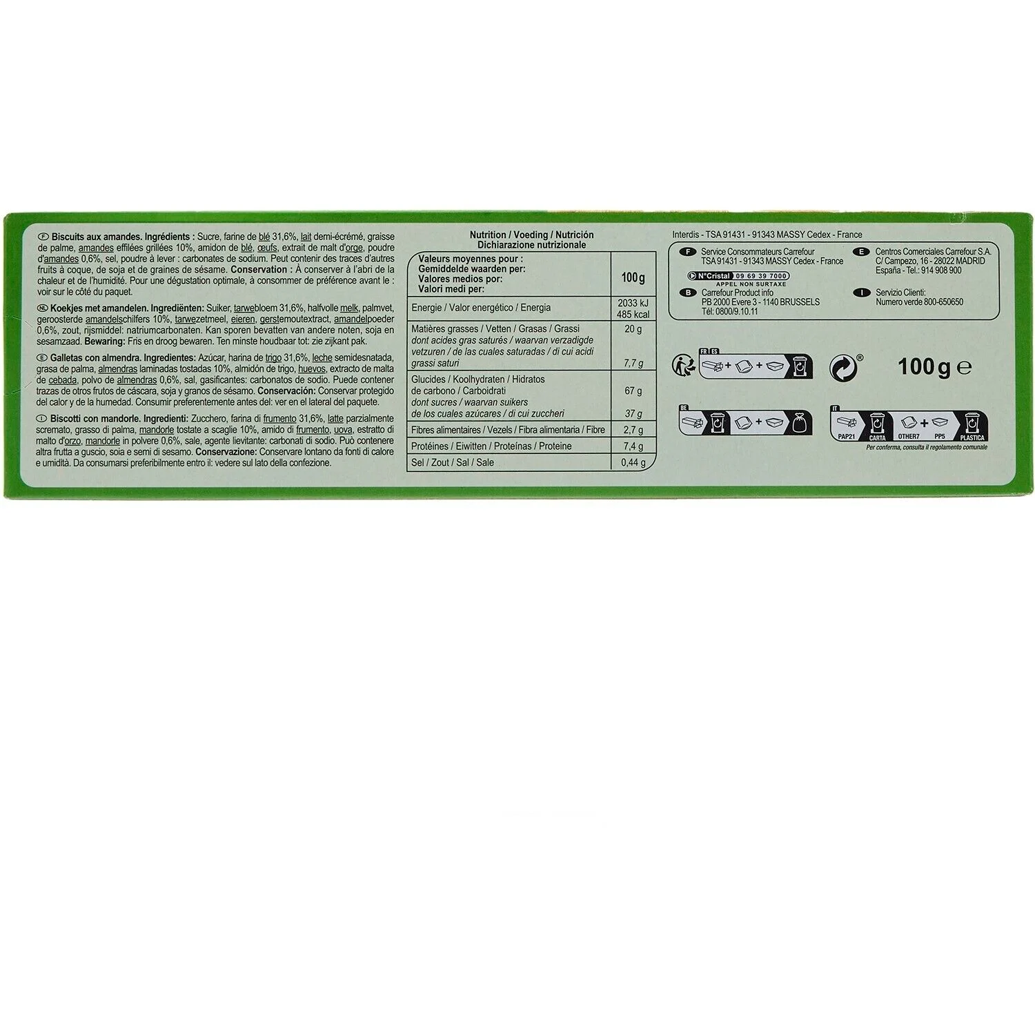 Sucre, farine de BLE 31,6%, LAIT demi écrémé, graisse de palme, AMANDES effilées grillées 10%, amidon de BLE, OEUFS, extrait de malt d’ORGE, poudre d’AMANDES 0,6%, sel, poudre à lever : carbonates de sodium.