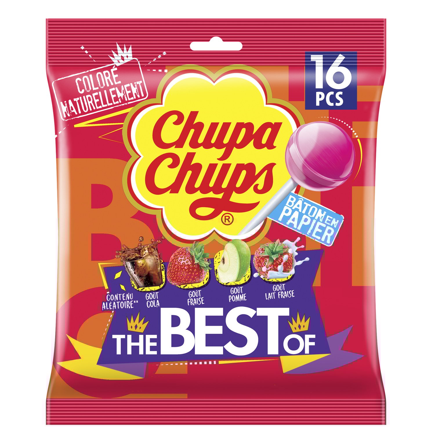 Ingrédients (Pour les parfums fruits): sucre, sirop de glucose, purée de fruits (pomme, cerise, framboise, ananas, citron vert, citron, fraise, pêche, banane, orange, myrtille, mûre, mangue, pastèque, kiwi) (3%), acidifiants (acide lactique, acide malique, acide citrique), arômes, colorants (rouge de betterave, curcumine). Ingrédients (pour sucette goût cola): sucre, sirop de glucose, acidifiants (acide lactique, acide malique, acide citrique), arômes, colorant (caramel au SULFITE d’ammonium). Ingrédients (pour sucette goût LAIT fraise): sirop de glucose, sucre, perméat de LACTOSERUM, purée de fruits (pomme, cerise, framboise, ananas, citron vert, citron, fraise, pêche, banane, orange, myrtille, mûre, mangue, pastèque, kiwi) (3%), LAIT entier en poudre (2%), beurre de cacao, colorant (rouge de betterave), arômes.