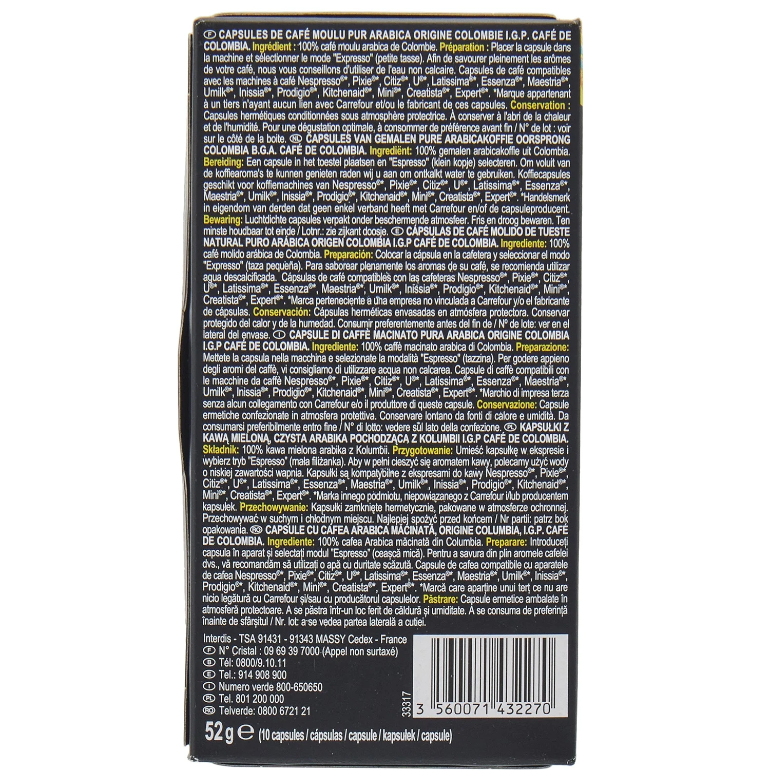 Café Capsules Espresso Intensité 7 Compatible Nespresso Costa Rica CARREFOUR SELECTION la boite de 10 – 52g