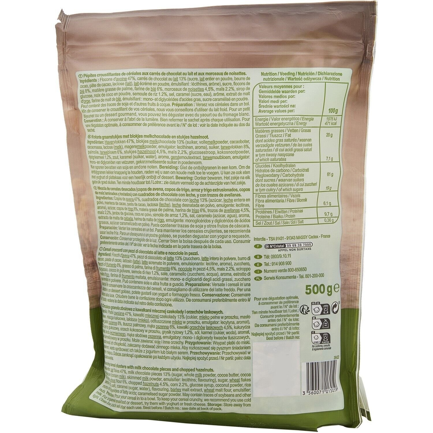 Flocons d’AVOINE 47%, carrés de chocolat au LAIT 13% (sucre, LAIT entier en poudre, beurre de cacao, pâte de cacao, lactose (LAIT), LAIT écrémé en poudre, émulsifiant : lécithines de tournesol, arôme), sucre, flocons de BLE 8%, matière grasse végétale de palme, farine de BLE 6%, morceaux de NOISETTES 4,5%, maïs 2,2%, sirop de glucose, noix de coco en poudre, semoule de riz 1,2%, sel, caramel (sucre, eau), arôme, extrait de malt d’ORGE, farine de malt de BLE, émulsifiant : mono- et diglycérides d’acides gras, sucre caramélisé en poudre.