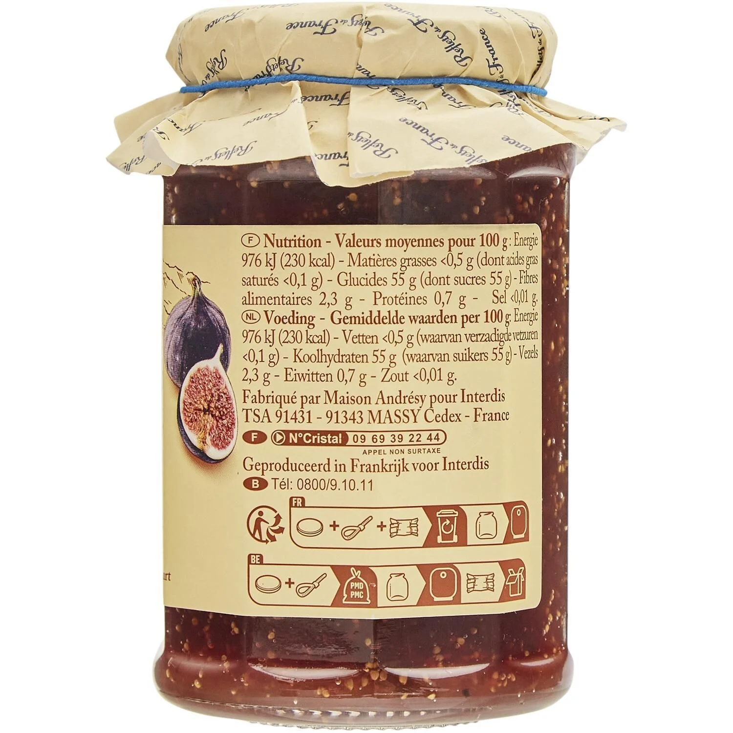 Figues de Provence, sucre (origine France), gélifiant : pectines, jus de citron concentré. Préparée avec 53 g de fruits pour 100 g de produit fini et teneur totale en sucres 56 g.