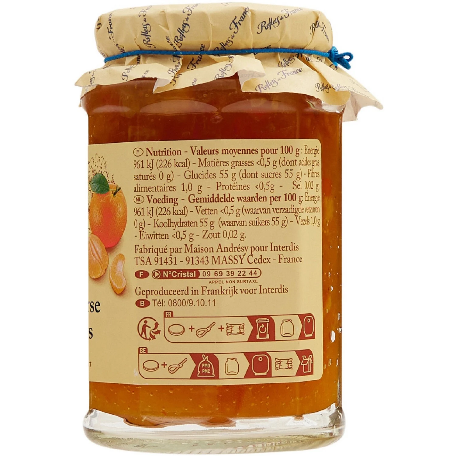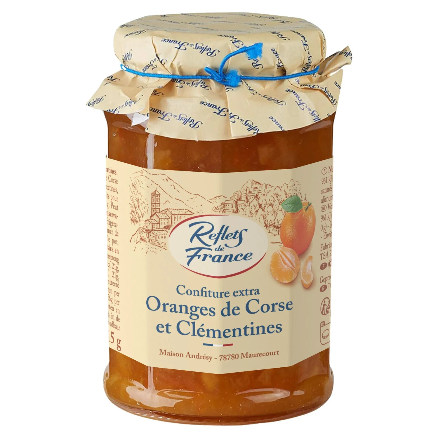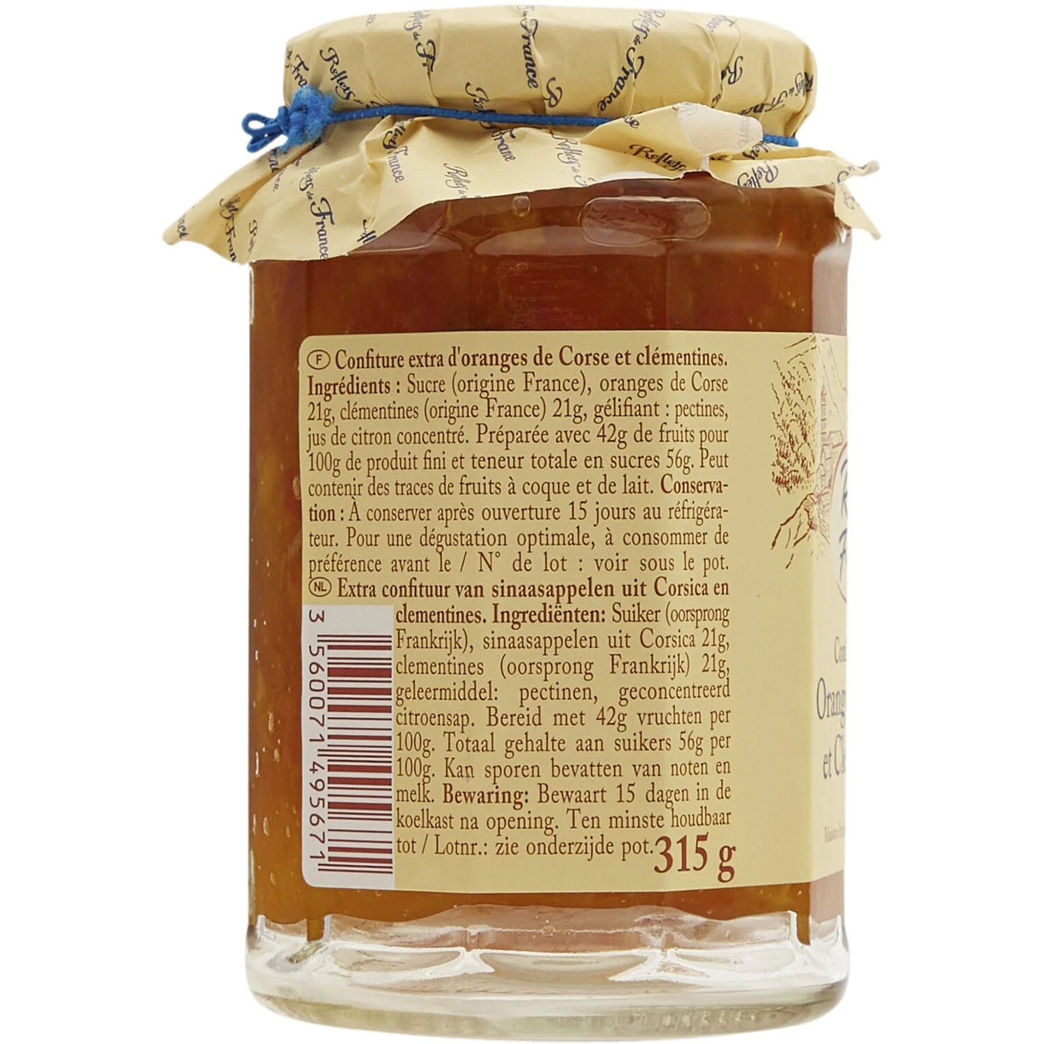 Sucre (origine France), oranges de Corse 21 g, clémentines (origine France) 21 g, gélifiant : pectines, jus de citron concentré. Préparée avec 42 g de fruits pour 100 g de produit fini et teneur totale en sucres 56 g.