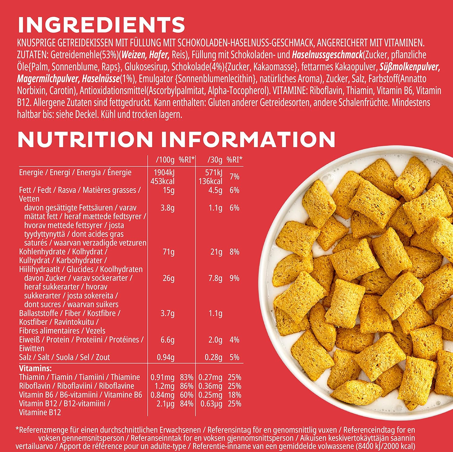 INGRÉDIENTS: Farines de céréales (53%) (BLÉ, AVOINE, riz), fourrage goût chocolat et NOISETTES (huiles végétales {palme certifié durable, colza} en proportion variable, sucre, sirop de glucose, chocolat (3.5%) {sucre, pâte de cacao^}, cacao maigre en poudre^, LACTOSÉRUM en poudre, LAIT Ã©crémé en poudre, NOISETTES (1%), émulsifiant {lécithines}, arôme naturel), sucre, sel, colorants (norbixine de rocou, caroténoïdes), riboflavine, thiamine, vitamine B6, vitamine B12, antioxydants (palmitate d’ascorbyle, alpha-tocophérol). ^Certifié Rainforest Alliance. En savoir plus sur ra.org.