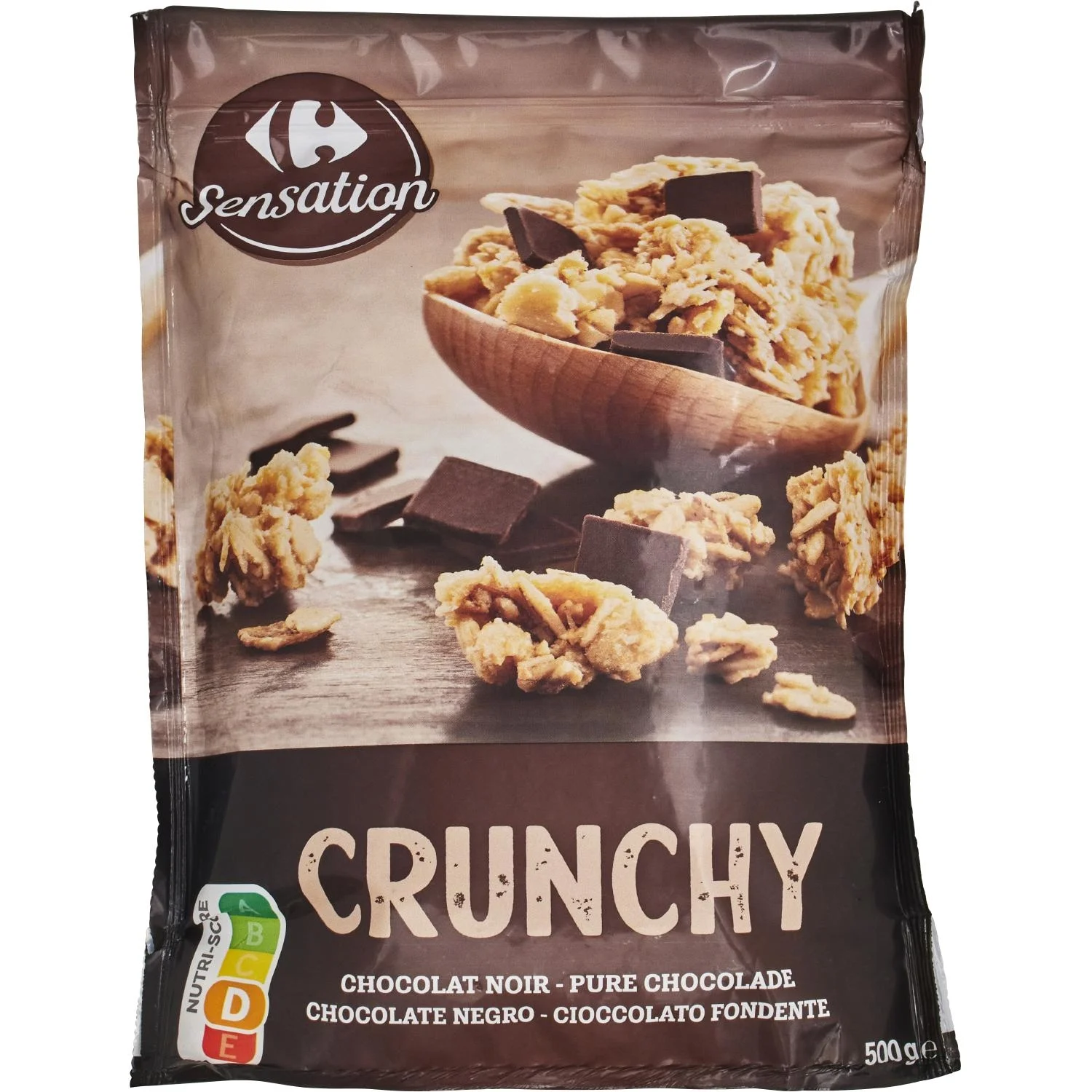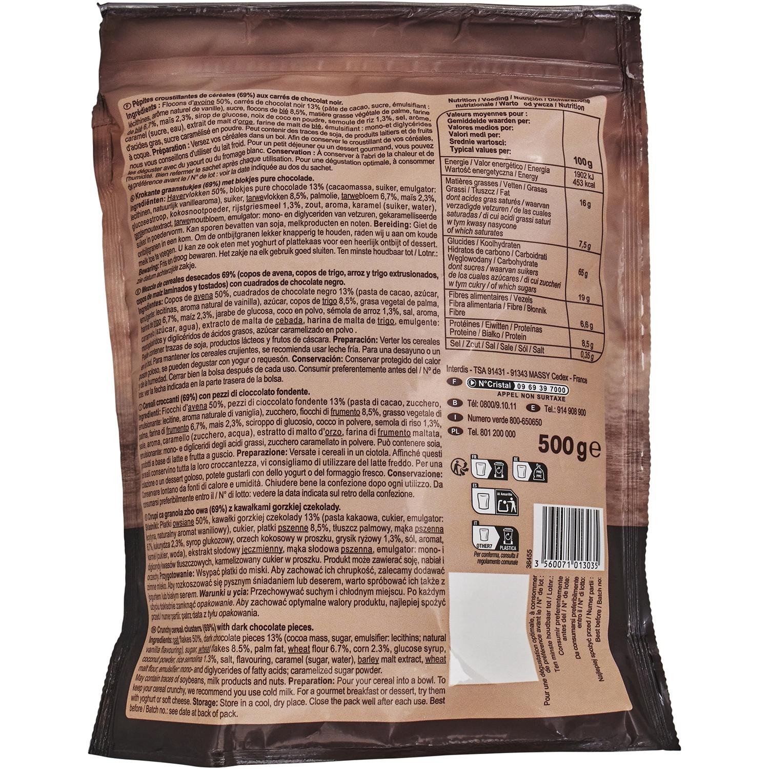 Flocons d’AVOINE complète 52%, flocons de BLÉ complet 12%, sucre, carrés de chocolat noir 12% (pâte de cacao, sucre, émulsifiant : lécithines, arôme naturel de vanille), huile de tournesol (huile de tournesol, antioxydant : extrait riche en tocophérols), farine de BLÉ 6,4%, sirop de glucose, semoule de riz 1,3%, noix de coco en poudre, caramel (sucre, eau), arôme, sel, farine de MALT de BLÉ, sucre caramélisé en poudre. Peut contenir des Traces de SOJA, de PRODUITS LAITIERS et de FRUITS A COQUE