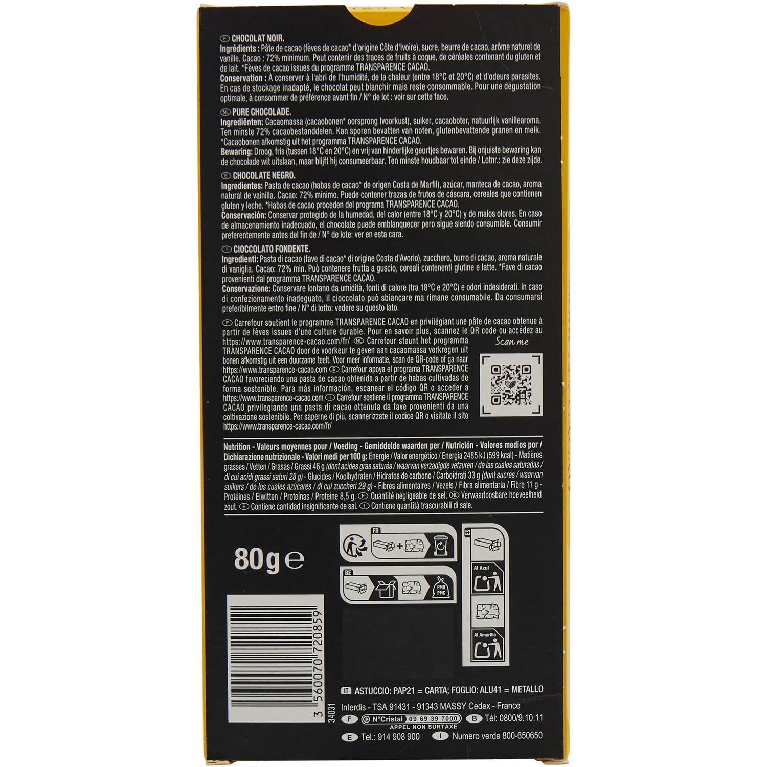 Pâte de cacao (fèves de cacao* d’origine Côte d’Ivoire), sucre, beurre de cacao, arôme naturel de vanille. *Fèves de cacao provenant du programme Transparence Cacao.