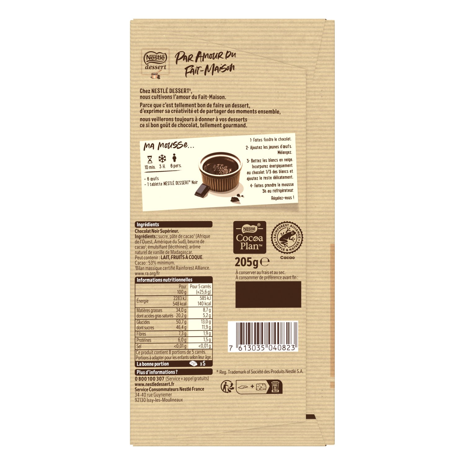 Ingrédients : sucre, pâte de cacao¹ (Afrique de l’Ouest, Amérique du Sud), beurre de cacao¹, émulsifiant (lécithines), arôme naturel de vanille de Madagascar. Peut contenir : LAIT, FRUITS A COQUE. ¹Bilan massique certifié Rainforest Alliance. www.ra.org/fr