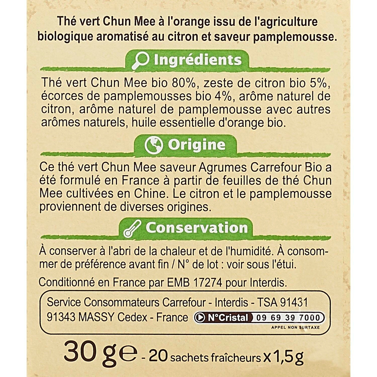 Thé vert Chun Mee bio 80%, zeste de citron bio 5%, écorces de pamplemousses bio 4%, arôme naturel de citron, arôme naturel de pamplemousse avec autres arômes naturels, huile essentielle d’orange bio.